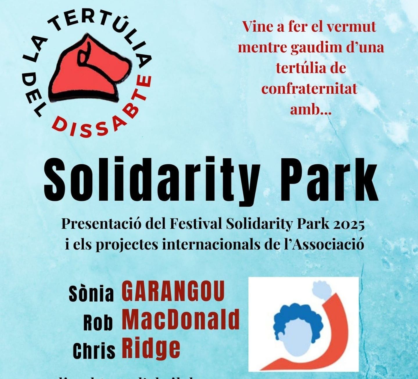 El dissabte 12 d'Abril t'esperem a la sala d'actes de la Barretina Vermella per fer el vermut amb la presentació del Festival Solidary Park 2025 i els projectes internacionals de l'associació.