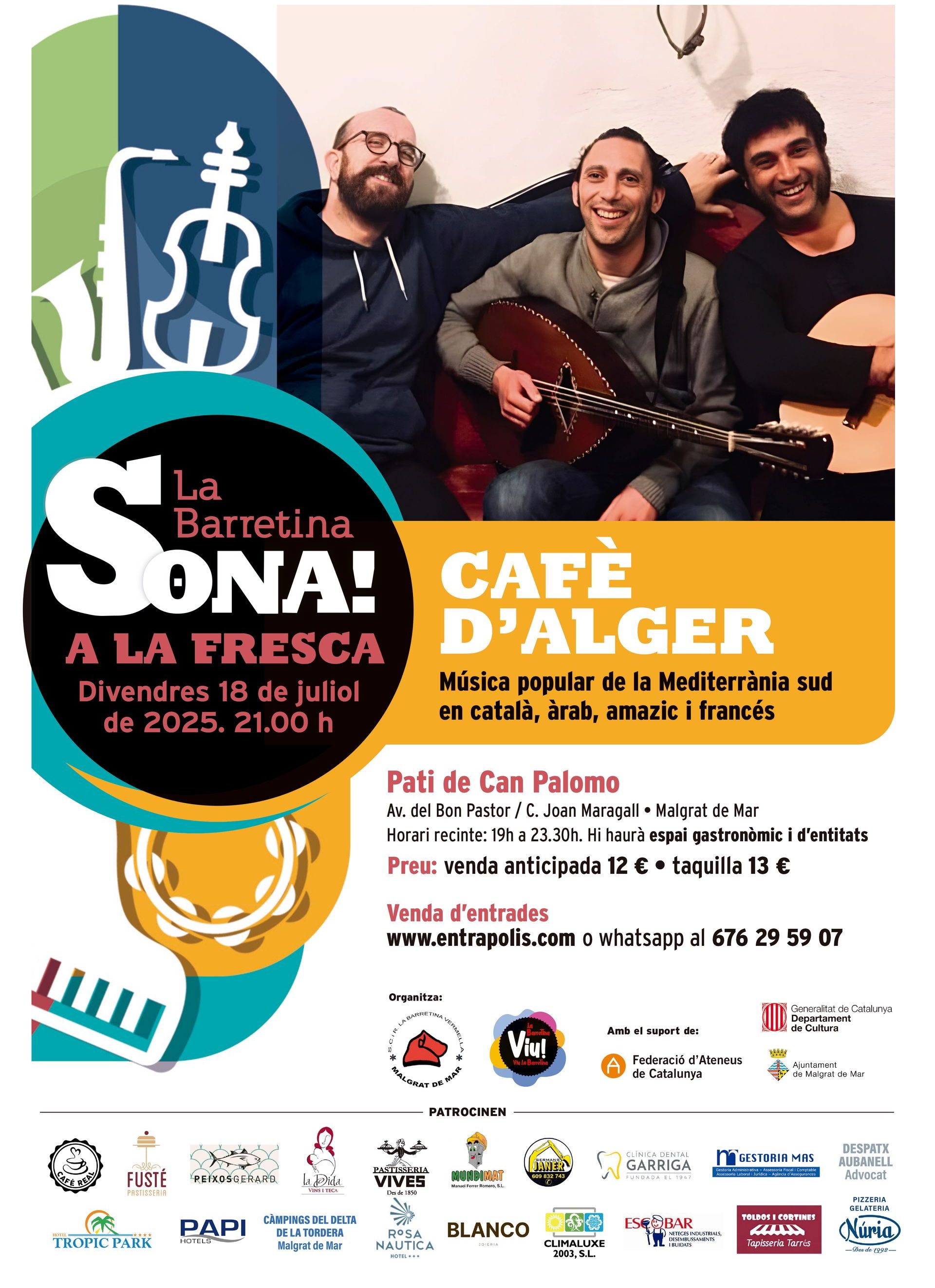 Cafè d’Alger ens convida a un viatge sonor pel sud de la Mediterrània amb un repertori que travessa fronteres i idiomes. Amb cançons en català, àrab, amazic i francès, el grup fusiona melodies tradicionals amb ritmes populars, creant una experiència musical rica, diversa i profundament emocional. La seva música evoca cafès antics, places plenes de vida i nits compartides entre cultures. Amb complicitat i calidesa, el trio construeix ponts entre pobles a través de la música, oferint un concert vibrant que ens connecta amb les arrels i la convivència del món mediterrani.
