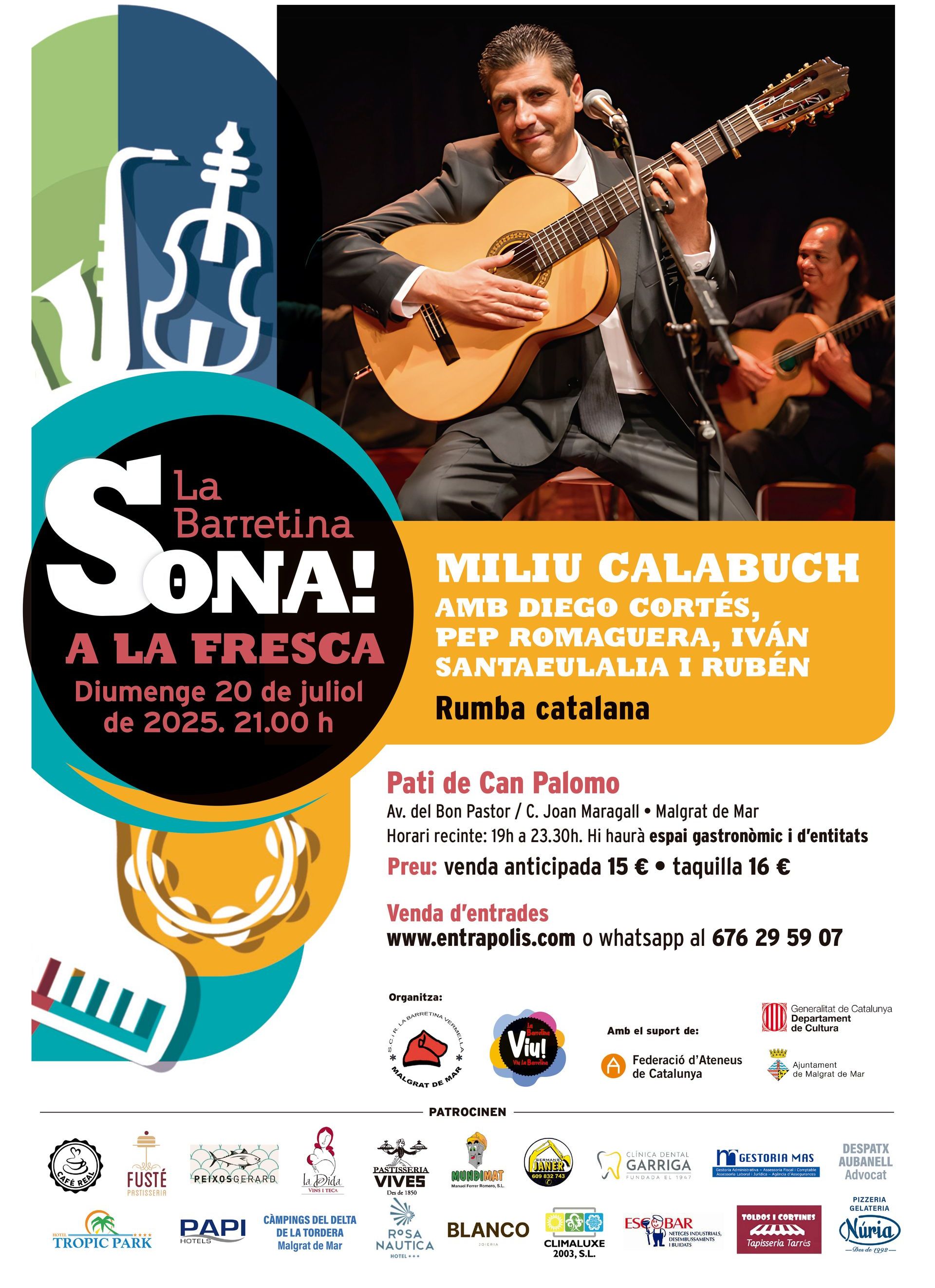Miliu Calabuch encarna l’essència més pura de la rumba catalana. Amb una veu càlida i una presència escènica plena de carisma, porta al públic un espectacle vibrant que homenatja les arrels gitanes i mediterrànies del gènere. Estarà acompanyat per músics de gran trajectòria: el guitarrista virtuós Diego Cortés, l’incombustible Pep Romaguera, el polifacètic Iván Santaeulalia i Rubén, formant una combinació explosiva que promet una vetllada plena de ritme, emoció i festa. Un concert per deixar-se endur pel compàs, cantar, ballar i viure l’autèntica rumba com cal... i gaudir del "ventilador", aquell moviment màgic de mans sobre les cordes que fa bategar el cor de la rumba catalana.